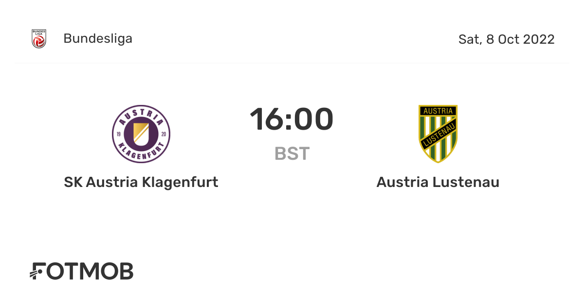 Austria Klagenfurt vs Austria Lustenau Prediction. On the 08 October 2022 at 1500 UTC meet Austria Klagenfurt vs Austria Lustenau in Austria in a game that we all expect to be very interesting. 8 hours agoSK Austria Klagenfurt SC Austria Lustenau Samstag 08102022 1700 Uhr.
